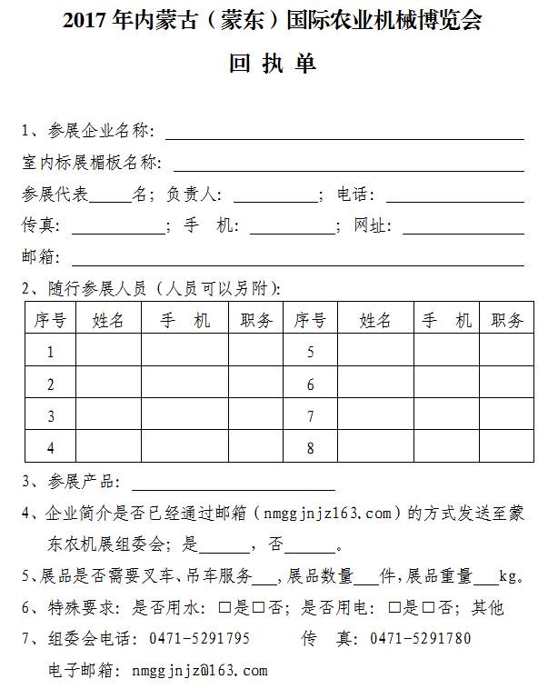 1、2017內(nèi)蒙古(蒙東)國際農(nóng)業(yè)機械博覽會回執(zhí)單。